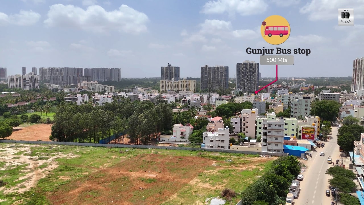 KRK Urban Ville is situated at an Ultra Prime Location On Varthur Sarjapur Road Near Gunjur Just 10 Minutes From Sarjapur Road & Whitefield Road in South East Bangalore. The project is just 500 Meters From State Highway 35, 4 Kms from Sarjapur Road & 4 Kms From Whitefield Road & Outer Ring Road.